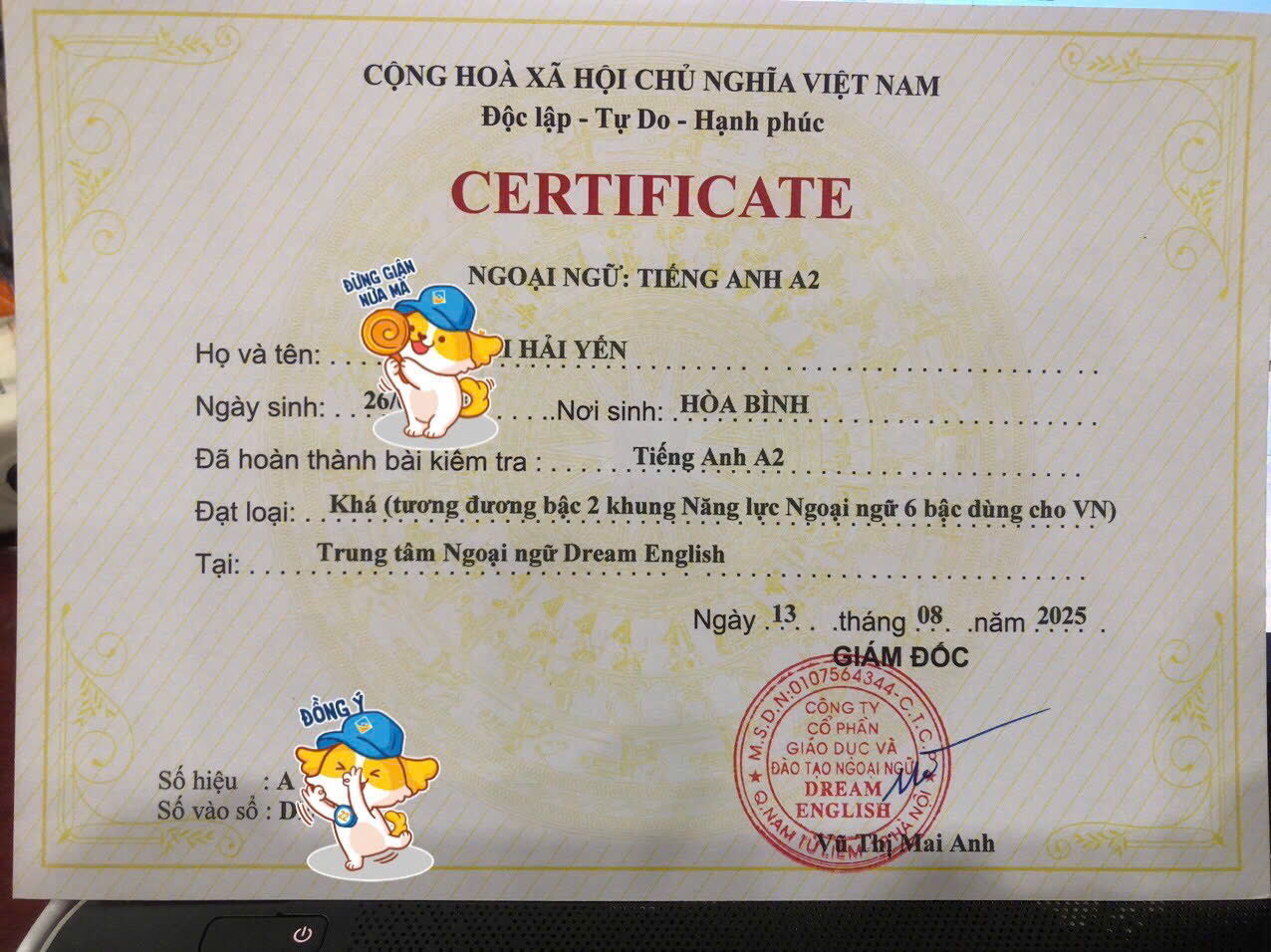Thứ ba, mẫu chứng nhận tiếng Anh A2; B1; B2 của Trung tâm ngoại ngữ Dream English được cấp theo mẫu đã đăng ký và được phê duyệt của Sở Giáo dục và Đào tạo Hà Nội (trong mục 2 về nội dung cho phép hoạt động giáo dục) của Quyết định số 2536/QĐ – SGDĐT ban hành ngày 14/10/2024.